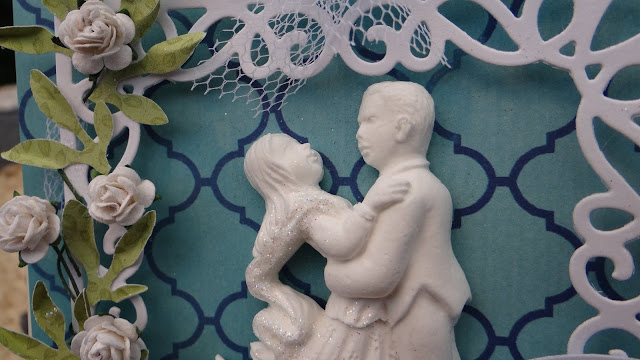 Uwielbiam spotkania "scrapownic", naładowana pozytywną energią tworzę :) Tym razem "turkusy" autorstwa Magdaleny Deberny- Mrude http://www.mrude.pl/. Dodałam trochę różyczek, listeczków, tańcząca para z masy plastycznej Marthy Stewart. Często ta para, służy mi za ślubną parę na kartkowych pracach.
